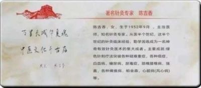 陈吉香院长,1968 年的春天,长白山脚下,建立起了一支解放军医疗队,来到了老百姓中间,免费给老百姓治病,用一颗银针,打开了聋哑禁区,聋哑人会说话,千年的铁树开了 花,教针灸和战伤救护,从那一刻起,给我留下了深深的烙 印,像打开了窗户一样,有了前进的方向,每天在学习,见到医务书就买,专心学习临床知识,背针灸穴位,勤学苦练,不断学习,探索,创新,攀登,攻研针灸医学理论和针灸技术,常在自己身上试针,达到了炉火纯青的地步。(18 岁开始学习针灸技术),1970 年至 72 年(20 岁)两年中西医卫校毕业(多次函授),功夫不负有心人,半个世纪的针灸生涯,突破了各种疑难重病.
