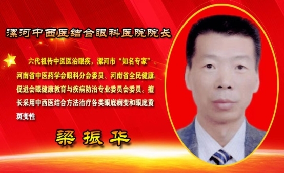 眼科专家梁振华院长出身中医世家,自幼研习中医理论,随父亲佐脉随诊,济世行医。从医以后梁振华深信祖国医学的宝贵和深奥,一定能够发掘出医治被眼科界公认的、最难治疗眼病的精髓,因此90年代开始常年带领自己的科研团队致力于此,研发出以“十二味明目口服液”为主线的治疗眼底病变和眼底黄斑变性最佳方法,填补了国内外中医治疗此类疾病的空白。并两次获得地市级科技成果二等奖。是我省较早运用中西医结合诊断和治疗眼部疾病的专家之一。30余年来积累了深厚的理论知识和丰富的临床经验。在治疗黄斑病变、糖尿病眼底病变、视网膜静脉阻塞、视网膜色素变性、眼底出血等眼科疾病上颇具造诣。对眼睑疾病、泪道疾病、角膜炎、白内障、青光眼、玻璃体浑浊、迎风流泪怕光等眼病治疗更是有其独到之处,使许多无望的眼疾患者重见光明,深受广大群众赞誉和好评。对青少年近视、散光及弱视等独创穴位埋线疗法,方法独到,效果好,随治随走,不影响学习和工作。
