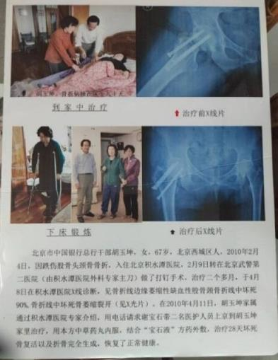 二、治愈创伤性骨折病例:徐闻县下洋镇99岁老人黄淑川,2007年因创伤左股胫骨折,在当地治疗20天没有骨痂生成,经用“宝石液”治疗26天,股胫骨基本形成,慢步行走,系世界上以中医治愈99岁高龄人骨折的首例。昆明市的陆思旻,2009年在解放军昆明总医院住院诊断为右股骨上中段粉碎性、开放性旋转性骨折并重度脑震荡,第三天出院到宝石医院,治疗2个多月,右股骨上中段旋转形粉碎性开放骨折正骨全面愈合效果良好,康复出院。2020年海南省患者黄桂英,87岁,因不慎滑倒致“左侧坐骨骨折”,翻身困难。在当地医院治疗十五天,因身体有多种基础疾病及后背多处压疮,效果不佳,后转来海口谢宝石中医院救治,用中草药“宝石液”方药湿敷患部,内服方药“猪骨方”治疗7天,后背褥疮基本痊愈,左腹股沟疼痛减轻,治疗7天可下床借助器械行走锻炼。2020年8月病情康复良好后出院回家。患者家属赠送锦旗感谢医院。