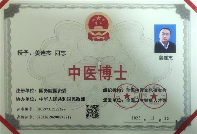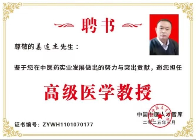 功夫不负有心人,经过无数次的实验、探索、研发,他成功研制了纯中药制剂“胃康散”,并申请了国家专利。这是一种,用于治疗急慢性胃炎、肠炎、胃溃疡、十二指肠球部溃疡等胃肠道疾病的中药组合物,具有良好的治疗功效。在研制新药的过程中,姜连杰不仅以体弱多病之躯每日通宵研究医学书籍,还经常亲自“尝百草”,当地人称他为“药痴”。而正是这种痴迷,让他积累了诊治各类疑难病症的丰富的临床经验和深厚的医学基础理论知识,研制出了纯中药剂“胃康散”“癌熄灵”,并申报国家专利(专利号:200610072389.6,201610738047.7)。目前,他已经研究出80多味中药,用于治疗各种疑难病。更值得一提的是,姜连杰多年来一直勤奋刻苦,敢于创新,诊脉断病精确神速,配方用药,辨病寻根,口碑远扬。他以民众疾苦为已任,常为贫困患者,孤寡老人免费治疗,为解决当地老百姓看病难、看病贵和看不起病备进心力,充分彰显了其医者仁心。