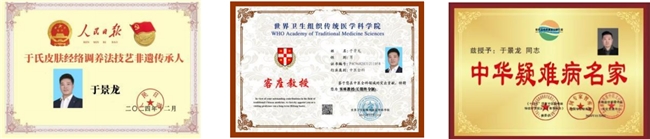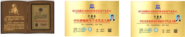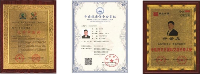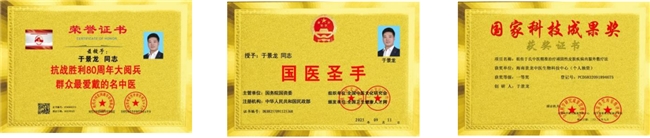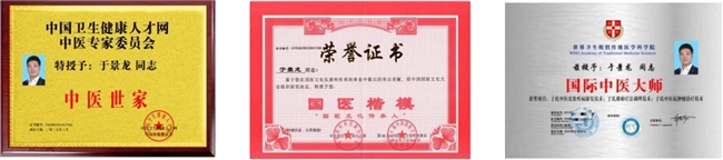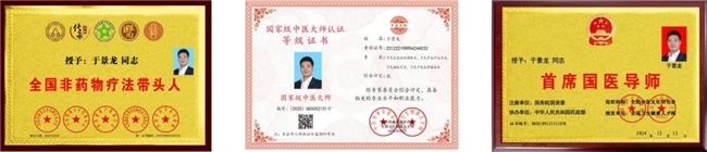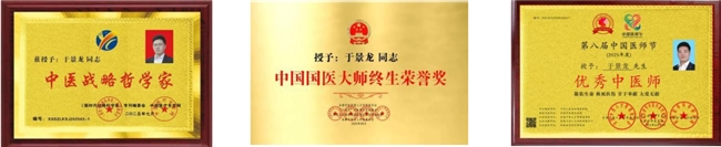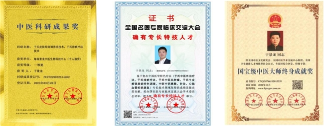 - 二零二五年:获“中医肿瘤研究学术代表人物”“中医皮肤疑难杂症创新医学代表人物”等认证;“于氏皮肤经络调养法”“于氏排瘀疗法”二项技术获“中医科研成果一等奖”,“祖传于氏中医精准治疗顽固性皮肤疾病内服外敷疗法”获“国家科技成果一等奖”;获评“中国国医大师终生荣誉奖”“第八届中国医师节优秀中医师”等衔,受邀为第二届中医春晚特邀嘉宾,获第八届公益事业大典“公益中医药科技创新奖”。