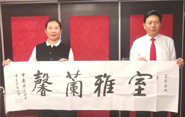 (李乘伊院士赠送自己创作的“室雅兰馨”书法作品给四川省巴中市侨联党组书记、主席黄惠女士并合影留念)