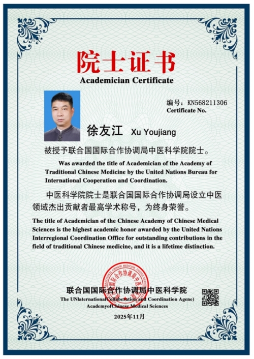 2025年,国际学术界传来振奋人心的消息一一中国著名中医药专家、"徐氏奇天疗法"创立人徐友江教授当选为世界智慧科学院院士。这一荣誉不仅是对其三十余年深耕中医创新领域的最高认可,更标志着中国传统医学与现代科技的融合成果正式获得国际权威机构的高度瞩目,为中医药走向世界树立了新标杆。