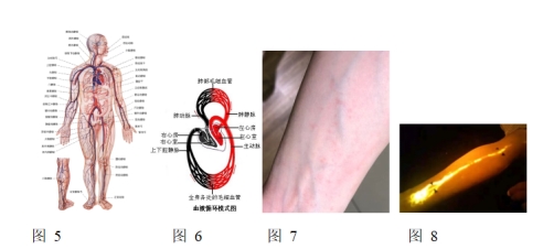 血管分动脉,静脉。从心脏出发回到心脏,叫循环,图6表示血液是循环运行的。与图4的12经脉图完全不同。