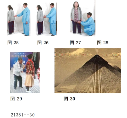 暗物质受几何图形和人的意念控制,动态暗物质碰到不同形状产生不同运动。暗物质碰到平面作直线运动,碰到园作园周运动,在锥顶作螺旋运动。如图30,是人们复印金字塔照片时显出来的光波。人生活在空间,天人一体,天体物质在人体都有,所以人体细胞就是量子组成,经脉气就是暗能量,也是量子能,人体就是能量体。所以,人体发出的外气就是能量(必须承认皮部呼吸才能承认发放外气)。