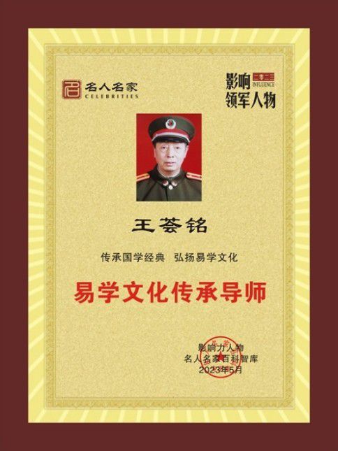 王荟铭:男,生于1942年,辽宁沈阳人,自幼酷爱易学,1962年参军,培养了坚定的正义感和坚强的意志,1967年入党,一心为党工作为人民服务。1985年到地方在企业做领导工作,身兼多职。1993年毕业于党校高级工程师。现任:“中国国际易学联盟副主席,中华易学文化促进会副会长、职业易学家,辽宁省姓名学术会委员、常务理事,中国姓名文化研究会高级命名策划师,国际周易应用研究院专家预测师,中国文化广播影视集团《名师讲坛》特约评委,北京建工建筑设计研究院建筑文化研究所特邀研究员,沈阳市皇姑区天言心理咨询中心创始人”等职务。被誉为:“中国易学家,中国十大杰出命名策划师、玄空风水名师。