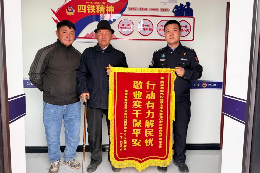 2026年3月28日,辖区群众库某带着家人专程来到海努克边境派出所,将一面印着“行动有力解民忧,敬业实干保平安”的鲜红锦旗送到民警手中,紧紧握着民警的手连连道谢,感谢民警不辞辛劳,帮他追回了被拖欠近5个月的血汗钱。