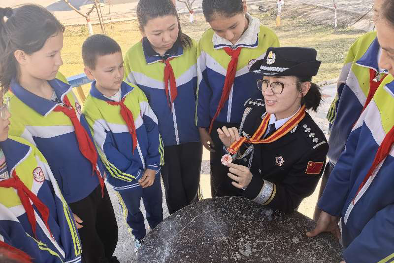 民警将承载着荣誉与使命的戍守边疆纪念章轻轻展示在同学们面前,孩子们围拢在石桌旁,眼神里满是好奇与崇敬。民警结合自身多年扎根边疆的亲身经历,用通俗易懂、饱含深情的语言,向学生们们讲述了纪念章背后的故事:从风雪巡逻路上的坚守,到守护辖区稳定的日夜值守;从服务辖区群众的暖心瞬间,到打击违法犯罪的坚定担当,每一段经历都凝聚着移民管理警察对党和人民的无限忠诚,每一个细节都彰显着戍边民警的家国情怀。学生们认真聆听,在潜移默化中接受了深刻的爱国主义教育和理想信念熏陶。