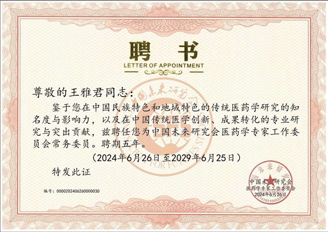 2025年3月,王雅君获世界卫生组织传统医学科学院聘书,担任传统医学领域专家,这份国际权威认可,是中国道医的世界认同。同年6月,其创办的公司获批加入《中医道医养生保健服务规范》国家标准课题组,从临床医者、品牌创始人,成为行业标准制定者,推动道医养生规范化发展。