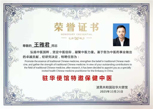 2025年10月26日,王雅君同时斩获赞比亚驻华大使馆两大认可——“驻华使馆特邀保健中医”聘书与“使馆指定用品”认证,在中外医学文化交流中留下浓墨重彩的一笔,让中国非遗道医智慧走出国门、服务海外民众。