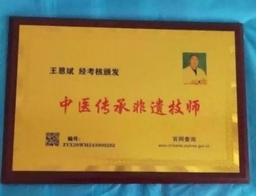 2021年1月传承人王恩斌申请国家首批中医传承非遗高级技师证,并被北京中西医慢病防治促进会授予个人会员牌匾。2022年9月23日,经中国传承人大数据库中心非遗和传统文化传承专业委员会审核,认为吉林省公主岭市王恩斌同志申报的“中医药针灸特色疗法”具有传承价值,符合申报条件,准许入库传承人网《中国传承·人才智库》,并授权使用受知识产权保护“中国传承人”牌证。
