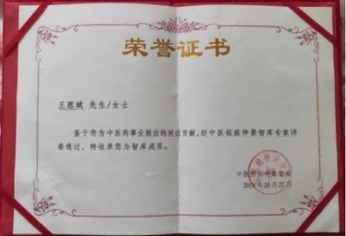 2019荣获第十届全国名老中医绝技演示交流大会特邀嘉宾。2019被收入中医祖庭仲景智库成员,并获得中国针灸协会颁发的传承证书。