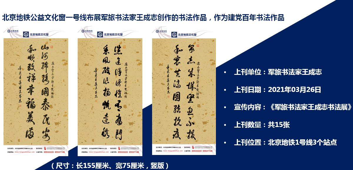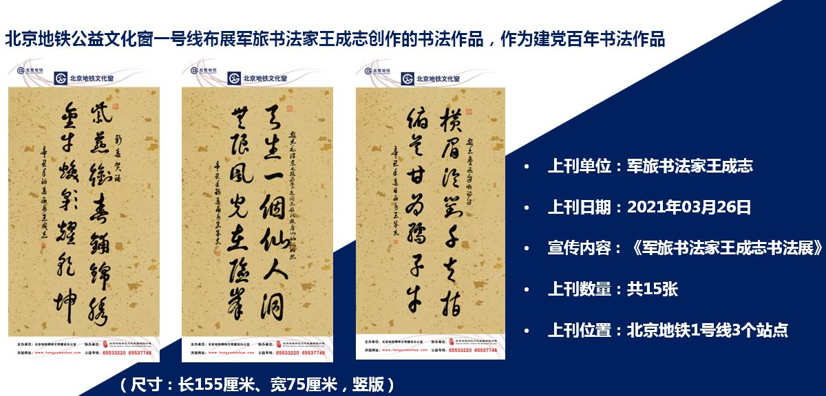 2021年是中国共产党建党100周年。王成志应邀为北京市地铁文化窗一号线布展创作书法作品。王成志作为一位军旅书法家,他积极适应新时代、新形势、新使命,以一贯的、饱满的家国情怀,用书法艺术庆祝建党100周年。主动把自己融入到文化大发展,大繁荣的时代背景之中。其作品笔意神采超逸,书风沉着劲健,体现了当代军人的威武、勇猛的秉性,用激情书写了当代军人的阳刚大美。