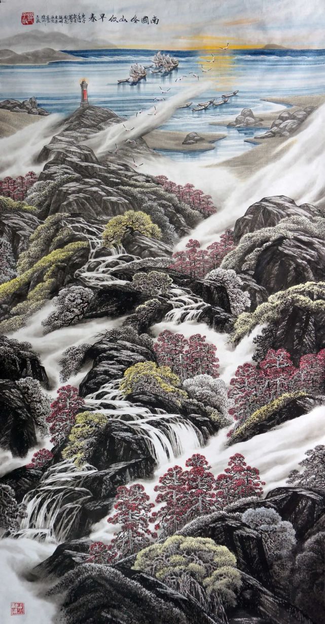 借古开今 孤标尘外。在这样的“山海式”作品里游目骋怀,山外有青山,河清兼海晏。色不掩墨,墨不覆色,层次分明,绝不凌乱!色彩渲染出来的海之风,带着苍而润的气息扑面而来,怡情切意。红日映山海,近处瑟瑟远处红,也是一首别样的诗!此般山水是新文人画的新经典,与古风山水前后衔接,让丹青渊妙代不绝人!由是,他的山水不但是审美的上品,也是展示地域文化风貌的奇观佳作!