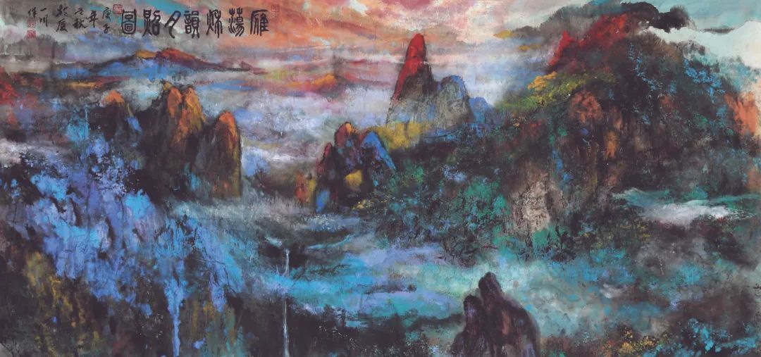 其二即“浓墨重彩”,用传统笔墨勾勒皴擦为骨,融西画光影立体感及色彩冷暖对比互补的原理,辅以青色(钴蓝、石青、群青)丹(朱砂、朱膘、曙红)原色调配泼洒为主调,然兼以黄绿赭辅助点染互补,以云水涌动留白达到气韵贯通的效果,形成强烈的视觉冲击,色彩斑斓厚重而富有质感,以“重彩浓墨交融”这种新的渲染方式增强拓展了中国山水画的表现力和艺术张力。