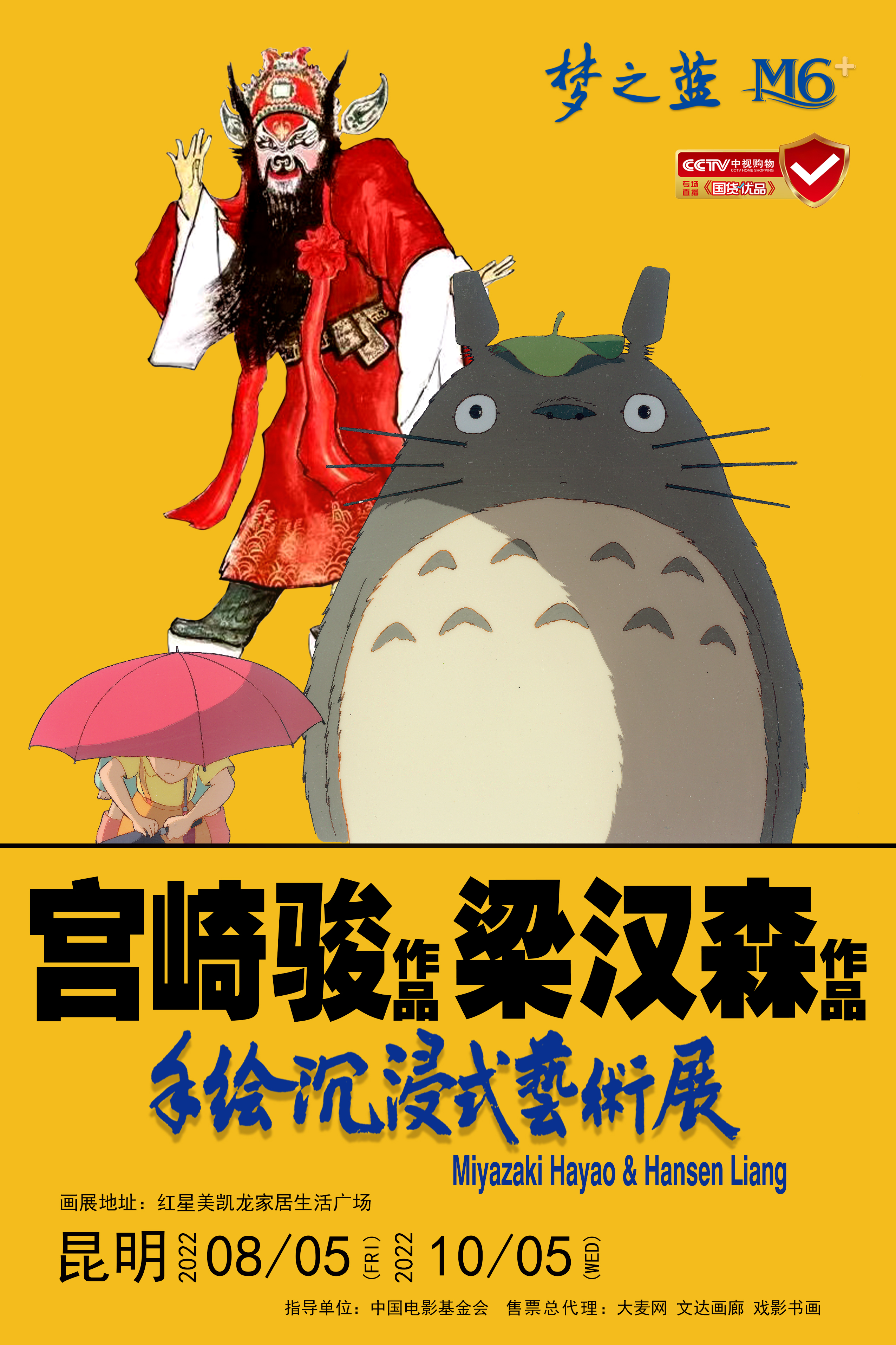 梁汉森介绍, 宫崎骏先生是享誉全球的动画电影的编剧,导演,获得多次电影世界大奖,获得奥斯卡终身成就奖,他的作品深受世界各国欢迎和喜爱。 此次展览以宫崎骏102 幅作品,梁汉森作品 102 幅为主体的殿堂级展览,同时设置了沉浸式九宫格展览结构,给观众提供了正能量,有趣味,有悬念的主题打卡点,同时有全国动漫短片展映和戏曲电影展映。九个打卡点的有奖猜谜及优胜者,将获得宫崎骏先生梁汉森先生作品的正版衍生品玩具奖品。闭幕式晚会上还将举办颁奖演出活动。期待一场引人入胜,知识点爆棚的展览在昆明绽放。这是一场别具匠心的展览,内容设置了:向上向善、华表擎天、神奇通道、寻找龙猫、殿堂画作,戏名猜谜、小美术家、书中寻梦,光影世界、同框合影等等打卡地,相信会令你心驰神往。这将是一次静态和动态相结合;视觉与参与互动相结合;好看与好玩相结合的沉浸式展览盛事!一定会让你脑洞大开,不虚此行!
