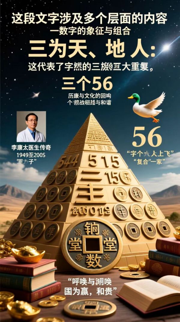 数序回环藏至理,阴阳相契守和宜。八七相乘积昭义,万汇共生皆有仪。康太从医承古训,银针仁术解民疲。华陀再世非虚誉,一片丹心系社稷。卦列铜钱凝瑞气,三番九转福泽滋。廿八蕴吉承天佑,百业兴荣岁检时。五十六族同源脉,天南地北共扬旗。和风吹彻山河秀,聚力同心志不移。数绘山河千古韵,文承华夏万年基。仙童妙谛传今古,盛世中华耀九夷。