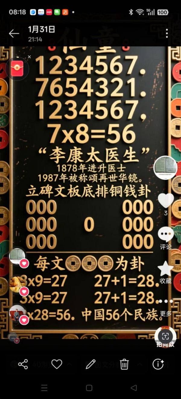 数藏玄奥凝清韵,天契人和沐泰熙。往复排筹皆合八,刚柔相济顾天仪。康太仁心明日月,银针妙手祛沉痍。悬壶不负苍生望,盛誉长留万姓祺。卦列铜钱承古意,三回九转意相驰。廿八纳后臻祥境,百业兴隆莫国基。五十六族情相系,九州一统志不移。同舟共济山河阔,聚力凝心岁月熙。数绎中华千古智,文彰盛世万年辉。仙童妙理传寰宇,华夏雄风振九陣。