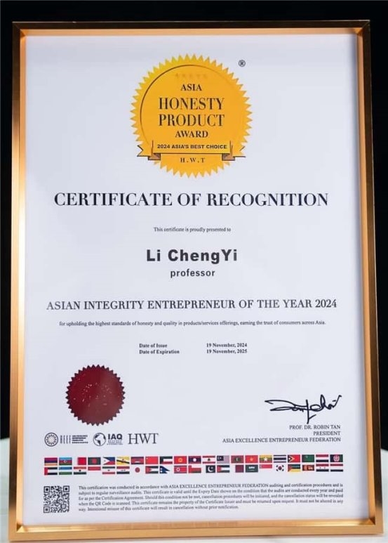促进会IAQ 协办。奖项设立宗旨在于推动企业诚信度,以表扬他们以诚信为本的崇高精神。自 2013 举办至今,亚洲诚信大奖已成为商界的信誉标志,被广泛主流媒体与机构媲美为“商界诺贝尔“,每年吸引超过万家企业争相提名。该奖项一共分为 5 个项目:亚洲年度蝉联百强诚信品牌大奖、亚洲年度百强诚信品牌大奖、亚洲诚信企业大奖、亚洲诚信企业家大奖、亚洲诚信产品大奖,至今,已有超过 1000 个来自世界各地优秀品牌,获得此项殊荣,成为消费者心目中的优质与诚信品牌的代表,获奖品牌能够在激烈的市场竞争中以诚信经营脱颖而出。因李乘伊教授在中医理疗,推进人类健康发展过程中倡导的正直和诚信,被授于亚洲诚信企业家大奖。