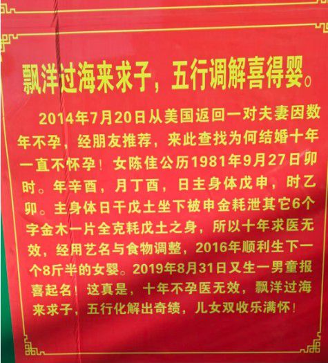 偏信專家不生育,到此调解出奇绩。香港老板结婚十七年一直因医院与專家断定夫妻都没有生育能力,所以就放弃了生孩子念头。2015年偶遇佛家老者推荐你俩还是可以生育,但必须到大陸沈阳找王老师可以化解生子女,2015年6月23日夫妻二人找到本处说一佛家老者推荐你老可以化解生子女!看其五行状况,男徐勇,公历1976年9月8日辰时丙辰,丁酉,癸亥,丙辰。日干癸水,水生木,木为孩子这八字中无木,所以不能生孩子。再看妻子,名叫李宇,公历1978年10月27日未时。戊午,壬戍,壬戍,丁未。日干壬水,水生木为孩子命中无一点木,所以也不能生孩子,问其居住几楼,住的六楼,六楼是属水所以结婚十七年一直无有生育能力。那么怎么才能化解生育呢?1,二人的名字也无木,分别起个艺名用于微信,2,住的房宅要住3层属木。3,服饰要突出绿色为吉,4,吃的食物增加核桃,大枣。5,行房时间必须选在亥月,因亥月有壬水甲木,水生木为孩子。于2015年11月怀孕,2016年9月19日从香港打進电话,衷心感谢王老先生祝您永远健康,永远健康!我于9月18日顺利生下8斤重女婴宝贝!求名!